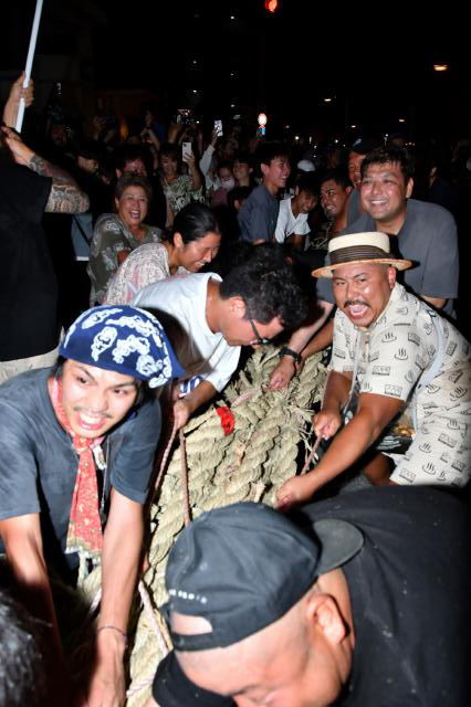 宮古島夏まつり2023(主催・同実行委員会)の2日目は22日、伝統の東西大綱引きを市公設市場前交差点で行った。新型コロナウイルスの影響により、3年連続で実施されなかったメインイベントが4年ぶりに復活。多くの市民らが参加して大綱を引き合った結果、東軍が勝利して向こう1年の豊作が約束された。最終日の23日は花火大会が実施される。