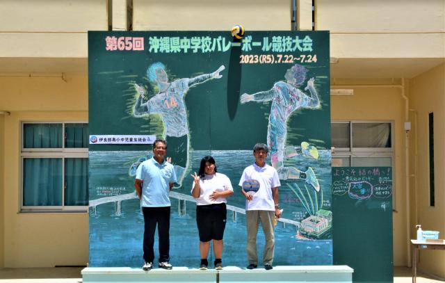第65回県中学校バレーボール競技大会のメイン会場となっている伊良部島中学校(佐久本聡校長)は22日、ウエルカムボードを設置して大会出場校を歓迎した。ボードは同校元校長の宮城克紀さんが「宮古に来てくれる学校をもてなそう」と発案。バレーボール男子日本代表の石川祐希選手、髙橋藍選手を描いたボードを生徒会と一緒に製作した。