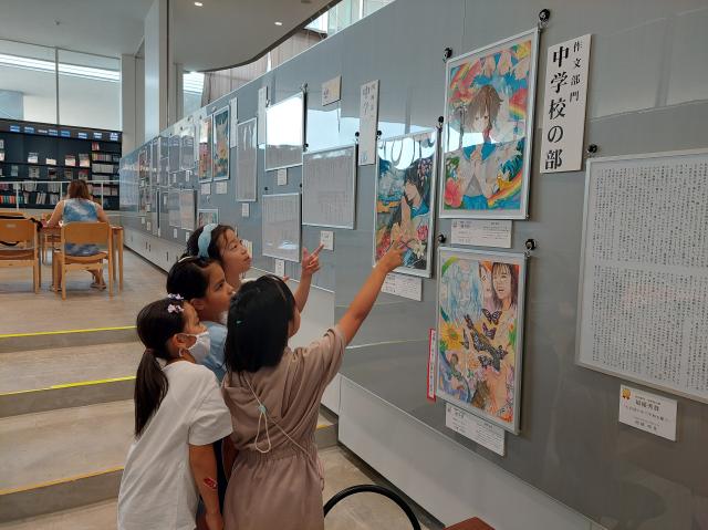 第33回「児童・生徒の平和のメッセージ展」の宮古島市展示会が28日、市未来創造センターのブラウンジングコーナーで始まった。8月6日まで、小中高、特別支援の図画、作文各部門の入賞作品を展示している。
