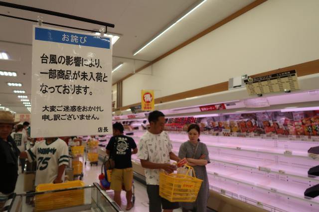 宮古島地方を暴風域に巻き込んだ台風6号の影響で、市内のスーパーでは生鮮食品の品薄が続き、冷凍食品やインスタント食品を買い込む客の姿が多く見られた。一方、貨物船の入港がストップしているためガソリンスタンドでも給油量を制限する動きがあった。今後も影響は長引く可能性もあり市民生活に響きそうだ。