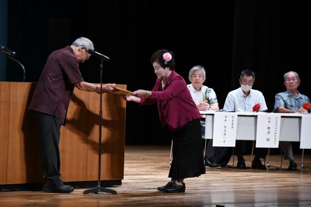 この後、老人クラブ育成功労者や優良老人クラブ、作品展入賞者を表彰した。與那覇支部長が一人一人に賞状と記念品を手渡し、日ごろの老人クラブ活動をたたえた。