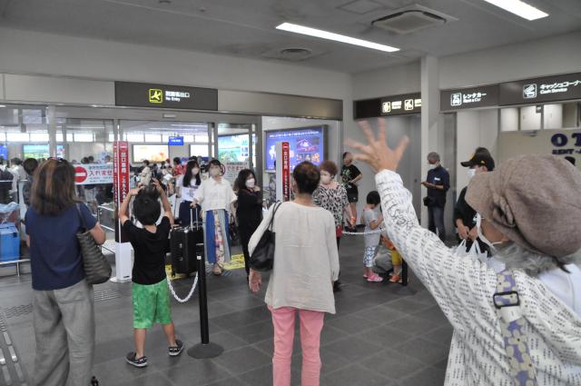 台風6号の影響で運休が続いていた宮古-那覇路線は7日、8日ぶりに運航を再開した。那覇空港で台風による強風の影響が残るため、一部欠航や出発遅延などが出たが、宮古空港では沖縄本島へ行く家族を見送ったり、那覇経由で久々に里帰りする親族を出迎えたりする市民らの姿でにぎわった。