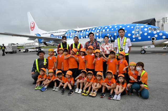 日本トランスオーシャン航空(JTA)宮古空港所(池原健一所長)は10日、いけむら保育園(大屋法聖園長)の園児を招待した機体見学を宮古空港エプロンで行った。5歳児19人が参加し、着陸したジンベエジェットを間近で見ると歓声を上げ、興奮した様子ではしゃいでいた。