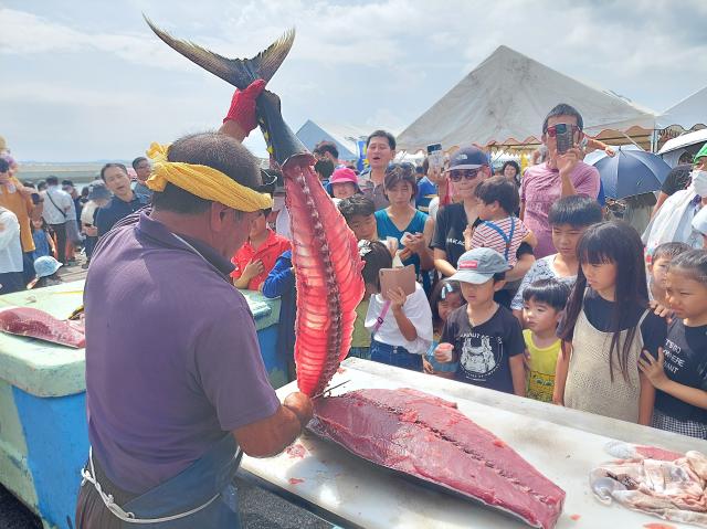 解体されたマグロは早速、刺し身として振る舞われ、長蛇の列ができた。平良から家族6人で訪れた右田秀生さん(39)は「解体ショーが見られて良かった。祭りを楽しみたい」と話し、マグロの刺し身を食べた長女のみどかさん(7)は「おいしい」と笑顔だった。