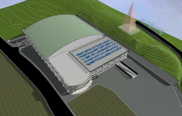 新体育館の完成イメージ図も披露された。施設正面に向かって右側に地下駐車場の出入り口を想定。屋根の一部には太陽光発電施設を設置して同施設の消費電力などに充てたい考えだ。