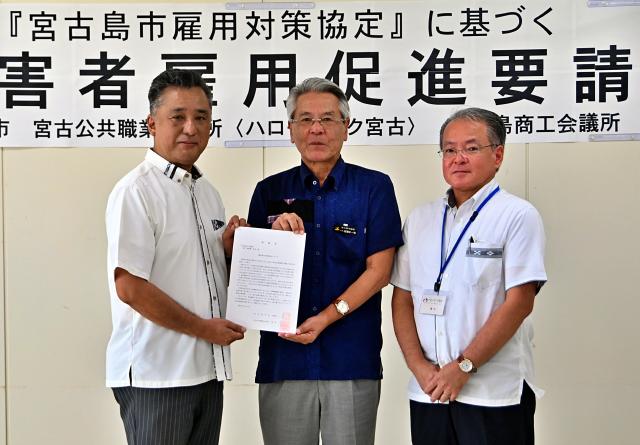 宮古島市、宮古公共職業安定所(ハローワーク宮古)は4日、宮古島商工会議所の根路銘康文会頭を訪ね、会議所会員企業に対して、障がい者雇用を促進するよう要請した。座喜味一幸市長が要請文を読み上げ、根路銘会頭に手渡した。