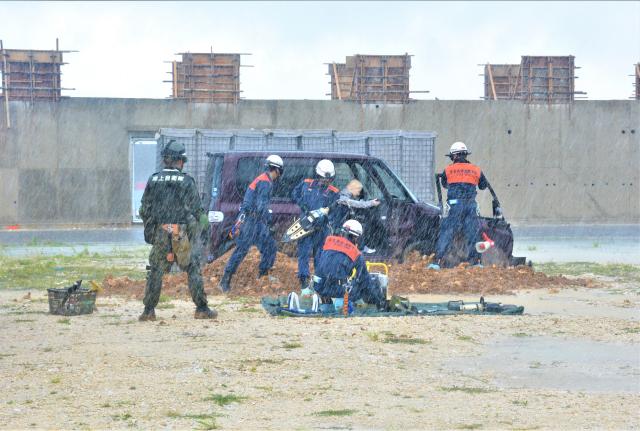 到着した陸自宮古島警備隊8人がスコップで堆積した土砂をかき出し、消防が油圧カッターでドアを切り離し車内に閉じ込められていた人を救助し救急車に運んだ。