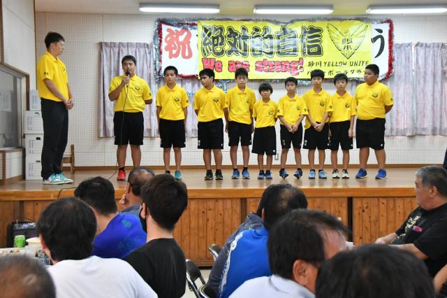 第38回全九州小学生バレーボール優勝大会の予選リーグ2位チーム同士で争うトーナメントで優勝した「砂川イエローユナイト」の祝賀会が9日、砂川公民館で開かれた。選手たちや保護者、地域の関係者らが多数参加。大舞台で活躍した選手たちを盛大に祝福した。