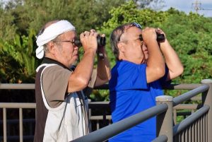 「白露のタカ渡り」として知られるアカハラダカ(タカ科)の飛去数調査が10日から下地の入江橋で始まった。宮古野鳥の会(仲地邦博会長)の会員が上空を通過するアカハラダカをカウントしようと、双眼鏡などで捜していた。初日と2日目の11日はアカハラダカの姿は確認できなかった。