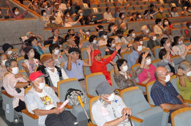 アトラクションの部では、東保育所の4歳児20人による「みるく世の声」が幕開けを飾ったほか、西原みどり会の「明治一代 女」、池間老人クラブの「今夜は乾杯」、宮原老人クラブの「さくら音頭」が披露され、久しぶりに開催される敬老会を盛り上げた。