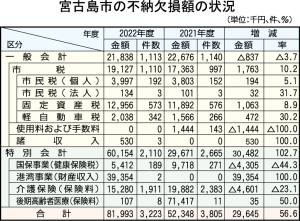 宮古島市の2022年度一般会計歳入での不納欠損は件数で1113件、金額にして2183万8859円となり、前年度に比べ件数で27件、金額で83万7697円それぞれ減少したことが分かった。1113件のうち市税が1110件(1912万7124円)で、その中で件数、金額が最も多かったのは固定資産税だった。