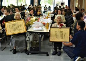 西原自治会の敬老会で伊良部タケさん、仲間初子さんに岸田文雄内閣総理大臣から100歳を祝う賞状と記念品が伝達された。敬老会は18日、西原公民館で開かれ2人ともそろって出席した。