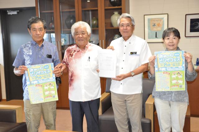 市山羊生産流通組合の新里聡組合長らが19日、市役所に座喜味一幸市長を訪ね、11月25日にパイナガマ海空すこやか公園で開催する「みゃーくピンザフェス2023」(主催・同実行委員会)に向け、応援や支援を依頼した。座喜味市長は「市として応援できることはやりたい。みんなで宮古のピンザ文化を盛り上げていこう」と協力する考えを示した。