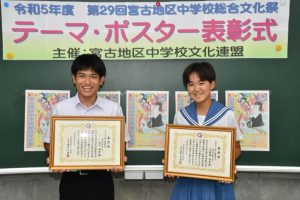 第29回宮古地区中学校総合文化祭テーマ・ポスター表彰式が20日、北中学校で開かれた。テーマの部は濱川晴紀さん(西辺3年)が、ポスターの部は与那覇日菜さん(同)がそれぞれ最優秀賞に輝いた。与那覇さんは2年連続の受賞。主催する宮古地区中学校文化連盟の渡久山英徳会長から2人に表彰状が贈られた。