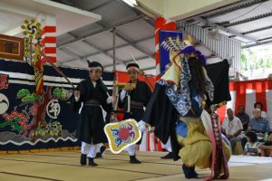 午前中最後の演目は「組踊り」。忠臣仲宗根豊見親組が披露された。仲宗根豊見親を大将とする宮古軍が与那国の首長「鬼虎」を征討する伝統の組踊りを約2時間にわたって演じた。