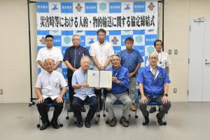 大神海運の与那城敏社長は「協定を結んだことで身の引き締まる思いだ。大規模災害が起きて島民が移動した際にバスが待機しているなどの連携が取れることが素晴らしい。島民の安全を第一に行動したい」と語った。