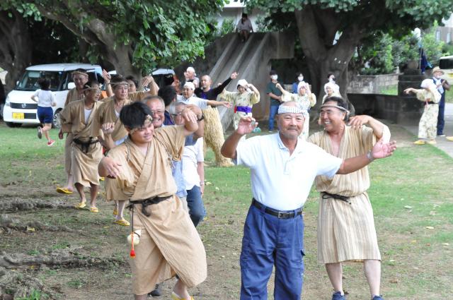豊年祭は午後3時に始まった。はじめに公民館で御願行事が行われ、砂川獅子舞(シーサアラス)保存会のメンバーが勇壮な獅子舞を披露し、厄を払いながら五穀豊穣を祈った。女性たちは踊りを奉納した。