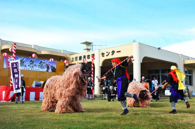 上区自治会の豊年祭は上区公民館で行われ、公民館隣の下里添神社で神事を執り行った後、獅子舞を奉納。三線演奏や砂川小学校児童による校歌遊戯、老人クラブのダンスなどの舞台余興も行われ、盛り上がりを見せた。