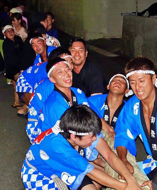 平良狩俣で9月29日、伝統の十五夜豊年祭(主催・狩俣自治会)が開かれた。満月の月明かりが降り注ぐ中、祭りを締めくくる大綱引きが今回初めて狩俣集落センター前で行われ、多くの地域住民が東軍、西軍に分かれて大綱を引き合い、向こう1年間の豊年を祈った。