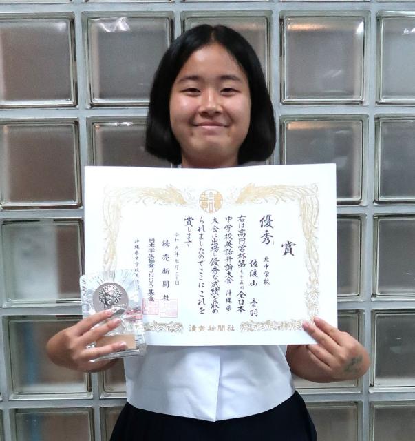 高円宮杯第75回全日本中学校英語弁論大会の県予選大会が9月30日、那覇市の県男女共同参画センター「てぃるる」で行われ、北中学校3年の佐渡山音羽(とわ)さんが優秀賞を受賞した。11月に東京で行われる全国大会に県代表として出場する。宮古から県代表が選出されるのは14年ぶりの快挙。同校で2日、受賞報告した佐渡山さんは「県予選ではみんな発音や表現、声もしっかりしていたので自分が選ばれて驚いたがうれしかった」と喜びを語った。