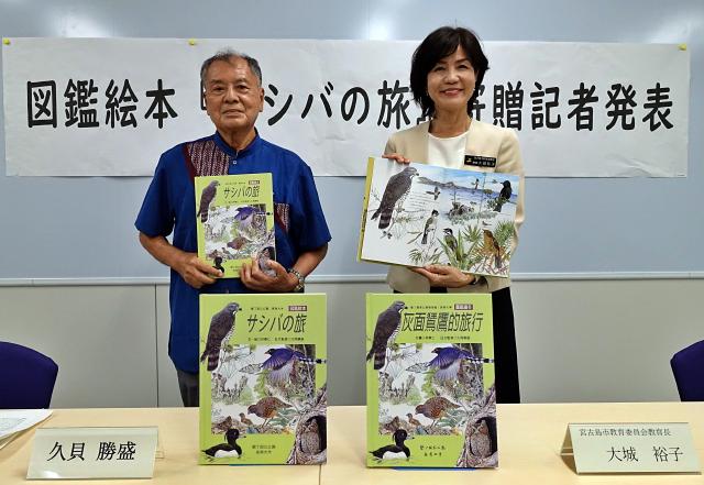 寄贈を受けた大城裕子教育長は「実際に読んでみたが、野鳥の絵は繊細なタッチで生き生きと描かれているし、文章もサシバと一緒に旅をする気分で読むことができた」と感想を述べた。