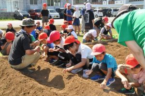 平良第一小学校(與那覇盛彦校長)3年生は11日、宮古地区就農青年クラブの砂川寛希会長らを講師に、ジャガイモとニンジンの植え付けを行った。総合的な学習の時間「宮古島の農作物」の中の取り組みで、児童たちは砂川会長らにコツを習いながら植え付けていった。