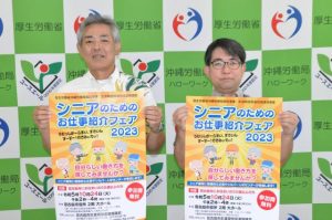 市生涯現役促進協議会(会長・松堂英彦市福祉部長)主催の「シニアのためのお仕事紹介フェア2023」(共催・ハローワーク宮古)が24日午後2時から、市役所大ホールで開かれる。松堂部長とハローワーク宮古の翁長響己統括職業指導官が13日、ハローワークで会見を開き、55歳以上のシニア層の積極的な参加を呼び掛けた。