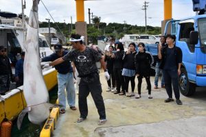 宮古総合実業高校商業科の生徒9人が考案したサメ漁獲同行体験のテストツアーが15日、池間島周辺海域や池間漁港などで行われた。生徒と教職員計10人が漁船に乗り込み、別の船がサメを釣り上げる様子を見学。帰港後は解体を見学、体験したほか、池間食堂でサメの調理も体験した。