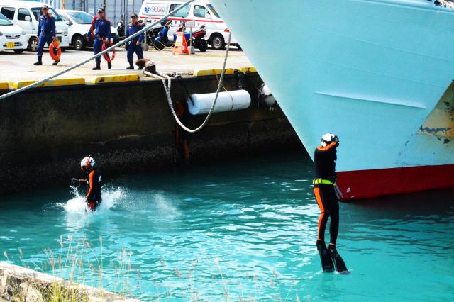 宮古島海上保安部(福本拓也部長)、市消防本部(宮國和幸消防長)の合同潜水訓練が18日、平良港第4埠頭(ふとう)で行われた。海保から巡視船「はりみず」の潜水士4人を含め10人、消防からは水難救助隊員ら15人が参加し、合同での捜索訓練などを通して海難救助の連携を深めた。