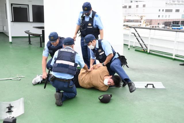 訓練では、船内で刃物を手に暴れて乗客を負傷させた不審者が、操舵(そうだ)室に向かう間に、従業員からの連絡を受けた船長が警察と消防に通報。不審者が操舵室に入れず大声を出して暴れているところに警察車両が到着し、警察官が不審者を追い詰め、船体上部の展望デッキで制圧、逮捕した。負傷した乗客は警察官らが応急手当を行い、救急隊員へ引き継いだ。