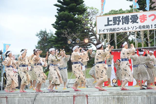 特設ステージは宮国民族芸能保存会の「宮国クイチャー」で幕開け。その後は上野中女子生徒によるストリートパフォーマンスや上野婦人会による琉舞、琉球國祭り太鼓のエイサー、陸上自衛隊西部方面音楽隊の演奏などが披露された。下地イサムさんのステージでは会場が一体となり盛り上がった。