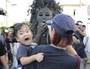 その後は集落中央の道路に集まった市民や観光客を追い掛け回し、つかまえた人に容赦なく泥を塗った。
