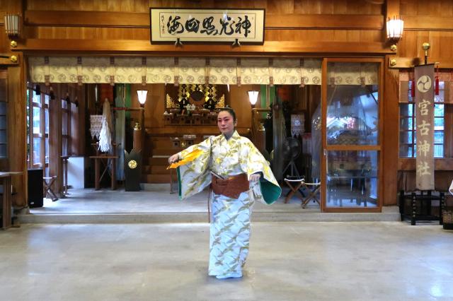 宮古神社で25日、宵宮祭が行われた。きょう26日に開催される例大祭の前夜祭に当たり、訪れた参拝者はこの1年間を無事に過ごせたことに感謝し、向こう1年間の五穀豊穣(ほうじょう)、無病息災、家内安全などを祈願した。神前では、舞踊や獅子舞、歌などが奉納された。