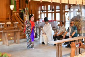 宮古神社は26日、年に1度の祭礼行事「例大祭」を執り行った。参拝者らは宮古島の繁栄と平安などを願った。神前では舞踊や歌謡などが奉納された。