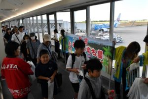 同空港では、JTA宮古支社と宮古島観光協会の関係者らが、横断幕を手にツアー客を盛大に歓迎。「宮古島へようこそ」などと声を掛けながら、パンフレットなどのノベルティグッズを手渡した。三線演奏も行われ、南国ムードを高めた。