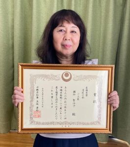 県発明協会主催の「第52回沖縄県発明くふう展」の表彰式が10月29日、那覇市で行われ、意匠の部最優秀賞の県知事賞に國仲智江子さんの「点字方式ゴミ袋」が選ばれた。2日、本紙の取材に応じた國仲さんは「これからも目の不自由な方や働く人とのつながりの輪が広がっていくよう頑張りたい」と喜びと抱負を語った。