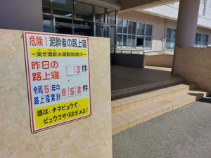 県は多量飲酒に関連する事件、事故などが後を絶たないことから、19年に「ちゅらうちなー安全なまちづくり条例(ちゅらさん条例)」を一部改正し、「アルコール関連犯罪防止」を新たに追加。「アルコール関連犯罪の防止に関する指針」には路上寝に伴う事故などは深刻な課題として、積極的な検挙活動などを行うとしている。