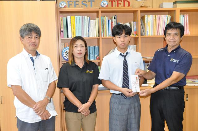 宮古バレーボール協会(友利肇会長)は7日、男子の県選抜選手として「JOCジュニアオリンピックカップ第36回全国都道府県対抗中学バレーボール大会」(12月25~28日、大阪府)に出場する伊良波琉琥さん(伊良部島中3年)に激励金を贈った。友利会長は「跳躍力、レシーブ力があり必ずスタメンに入れる。寒さ対策など体調管理に注意し、宮古バレーをアピールしてほしい」とエールを送った。