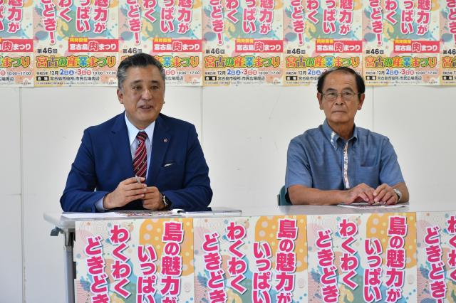 第46回宮古の産業まつりの実行委員会(根路銘康文委員長)は8日、宮古島商工会議所で会見を開き、12月2、3日に開催される同まつりへの来場を呼び掛けた。今回は「宮古島肉まつり」も同時開催。根路銘委員長は「盛りだくさんの内容を予定している。多くの皆さんに来場していただきたい」と話した。
