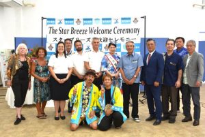 国際クルーズ船のスターブリーズ号(マーシャル船籍)が8日、平良港のクルーズ船専用バースに入港した。乗客数は約200人。歓迎セレモニーが平良港クルーズ船受け入れ施設内観光案内所で行われ、花束贈呈や三線演奏、カチャーシーが披露された。
