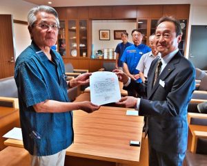県農業共済組合(工藤俊一組合長理事)の関係者一行は9日、市役所に座喜味一幸市長を訪ね、次年度の農業共済事業運営負担金や収入保険加入推進事業補助金などの予算措置について特段の配慮を求めた。座喜味市長は要請内容に理解を示し「もっともっと加入者を広げて農家が安心して仕事ができる環境にしてほしい。そのために私たちも協力したい」と話した。