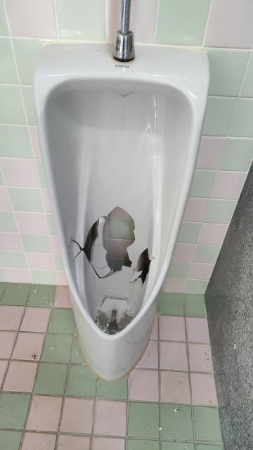 被害状況は、トイレの窓ガラスが6枚割られ、小便器は二つあるうちの一つが割られていた。