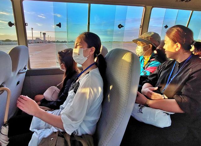 滑走路の運用時間を避けるため、午前6時からの開催。管制塔の後方から差し込む朝日を受けた滑走路と、目の前を遮るものが何もない広大な景色に参加者たちは大満足で、バスの中からデジタルカメラやスマートフォンで記念撮影する姿が見られた。