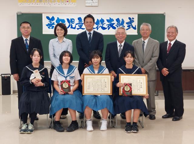 2023年度県善行児童生徒表彰の伝達式が13日、県宮古教育事務所であり、宮古地区退職校長寿会の知念安則会長が高江洲彩(せり)さん(久松中3年)と鏡原中生徒会の砂川満智佳会長に賞状を手渡した。毎年、学習や生活面で他の模範となるような活動をしている児童生徒を表彰しており、今年は宮古地区から高江洲さんと鏡原中生徒会が選ばれた。