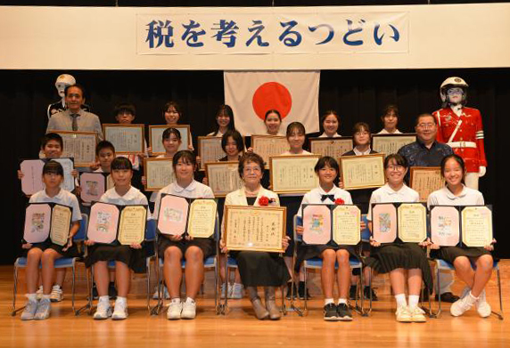 【中学生の税についての作文】沖縄国税事務所長賞=砂川満智佳(鏡原3年)▽宮古島税務署長賞=新城萌依(平良3年)▽県納税貯蓄組合連合会優秀賞=新垣羽七(平良3年)吉田百花(北3年)▽宮古青色申告納税貯蓄組合長賞=仲原季美(北3年)池原匠(同)▽県宮古事務所長賞=狩俣桜華(北3年)▽宮古地区租税教育推進協議会代表幹事賞=川満碧(狩俣3年)