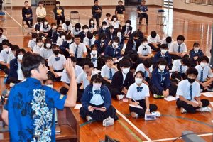 城東中学校で24日、地域の先輩によるキャリア教育講話が行われた。西城中出身で現在はプロバスケット・Bリーグ琉球ゴールデンキングスのコーチを務める末広朋也さんが「(夢、目標に向かって)挑戦し続けてほしい」と、全校生徒に向けて熱いエールを送った。