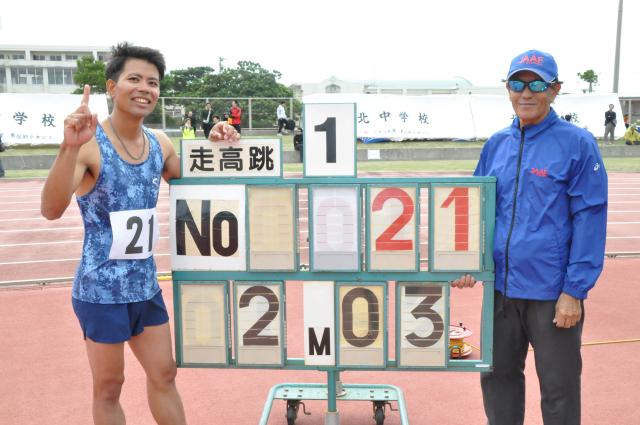 第75回県民体育大会の陸上競技が25日、市陸上競技場で開幕した。26日までの2日間、14市郡の代表選手がトラック・フィールド競技で優勝を懸けて競い合う。初日の宮古勢は、男子30代走り高跳びで上原晋之助(市上野)が2メートル03で大会記録、県記録を更新して優勝するなど活躍を見せた。
