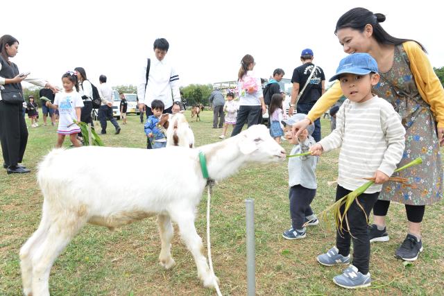 子ヤギとの触れ合いを楽しんだ豊見山珂壮さん(10)は「ヤギを初めて触った。毛が少し硬い」と話し、父親の博成さんは「動物と触れ合えるようなイベントはあまりないので良いと思う」と話した。