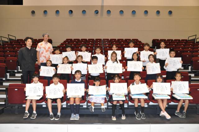 第41回JTA・RACあおぞら図画コンクール宮古地区表彰式が30日、市未来創造センター多目的ホールで行われた。玉城力JTA宮古支社長が市内から入選した25点を表彰し「本当に表情豊かな絵が多く、今にも飛び出してきそうな彩り豊かな作品が並んでいる。大好きな宮古の絵を頑張って描いてくれた皆さん、本当におめでとう」と述べ、入選した児童たちをたたえた。