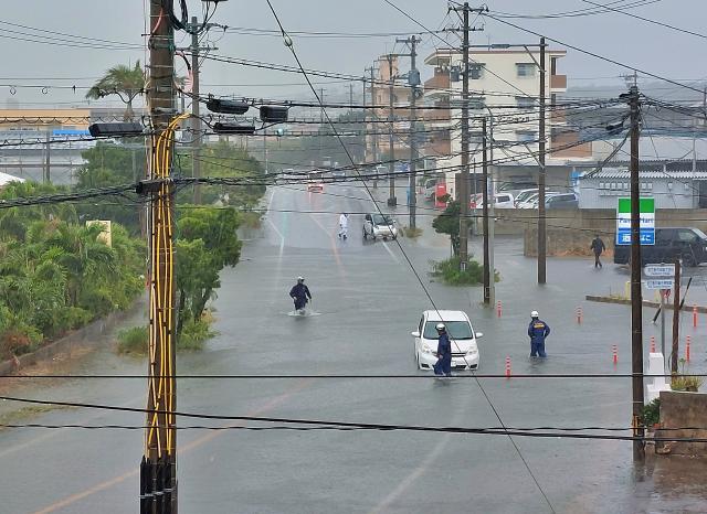 宮古島地方は4日、寒冷前線上にある低気圧の影響で強い雨が降り、平良下里では午前11時40分から午後0時40分までの1時間に42㍉の雨量を観測した。宮古島地方気象台は午前11時9分に大雨警報(浸水害)を発表し、低い土地の浸水に警戒するよう呼び掛けた。大雨の影響で、市内では各地の道路が冠水し車両が立ち往生する様子などが見られた。大雨警報は、午後6時33分に注意報に切り替えられた。